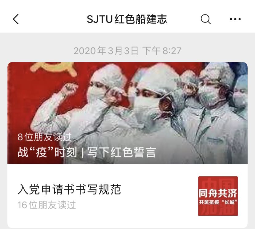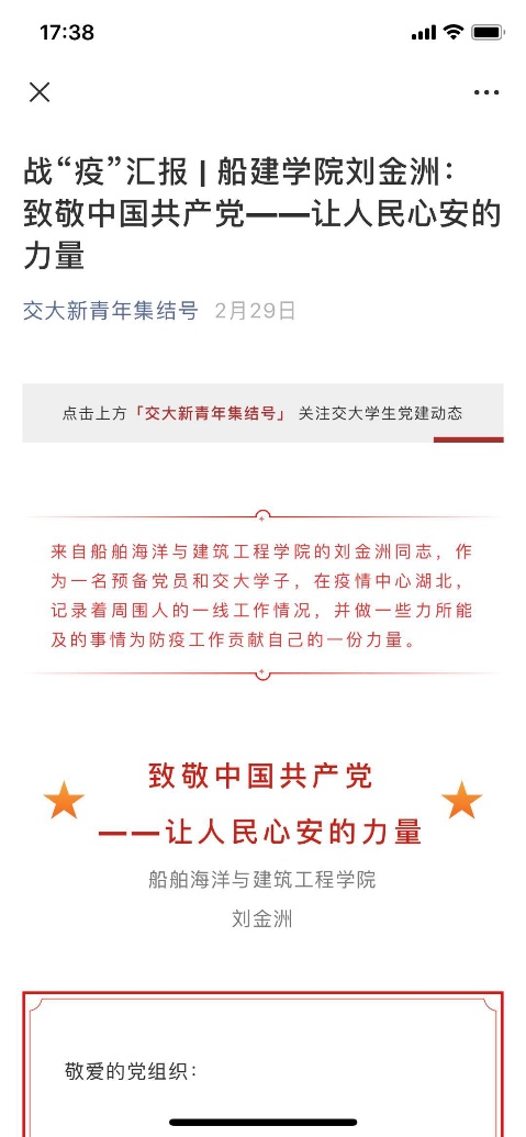 bevictor伟德多名党员、入党积极分子、入党申请人主动报名参加社区防疫志愿者,为战“疫”工作贡献自己的青春力量。在线上主题党日活动上,参与志愿服务的同学们分享了他们的抗疫故事,并带动更多的船建学子通过志愿服务、捐款捐物等方式为打赢这场疫情防控阻击战作出自己的贡献。公司党建公众号“SJTU红色船建志”和员工工作公众号“船建人”积极挖掘典型,及时报道,扩大影响,发挥朋辈教育实效。
