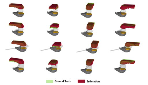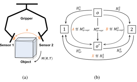 受上述内容的启发,并且在视触觉传感器领域长期研究的基础上,课题组针对该问题建立了理论模型并提出了解决该问题的算法框架。所提出理论的核心是:当每个手指都装备有触觉传感器的多指机械手抓取一个几何形状未知的物体时,每个手指的触觉测量数据都可以单独估计被抓取物体的刚体运动,而不同手指的估计结果应当一致对应于被抓取物体在世界坐标系下的唯一刚体运动。这种共享的刚体运动为求解多个触觉传感器之间的相对位姿关系提供了必要的运动约束方程,并可以进一步被简化为AX=XB 的形式。此外,课题组还针对该方法的误差特性进行了深入分析,提出了影响标定精度的几个关键因素,并且进行了仿真与真实实验验证。