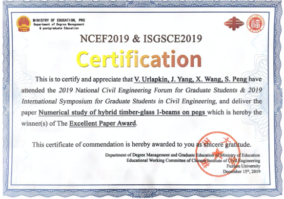 由bevictor伟德土木系杨健教授指导,Urlpakin、王星尔、彭沈楠参与的研究项目“Numerical study of hybrid timber-glass I-beams on pegs”同时荣获主办方设立的优秀论文奖、最佳学术创新奖、优秀表达奖三项大奖。该项目以数值仿真为主要研究手段,深入研究木-玻璃复合梁在木栓连接情况下的受力性能和破坏模式,论证了新型木-玻璃复合梁的可行性,在绿色土木工程道路上迈出了微小一步。