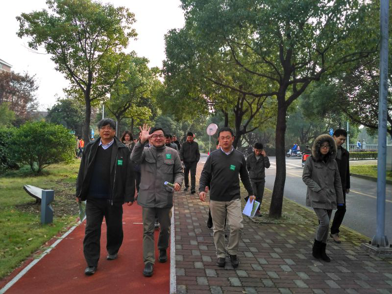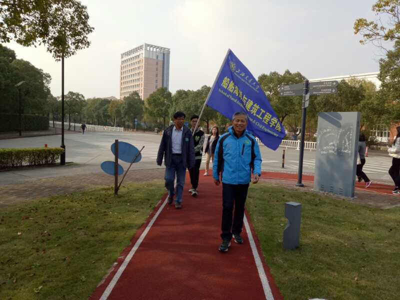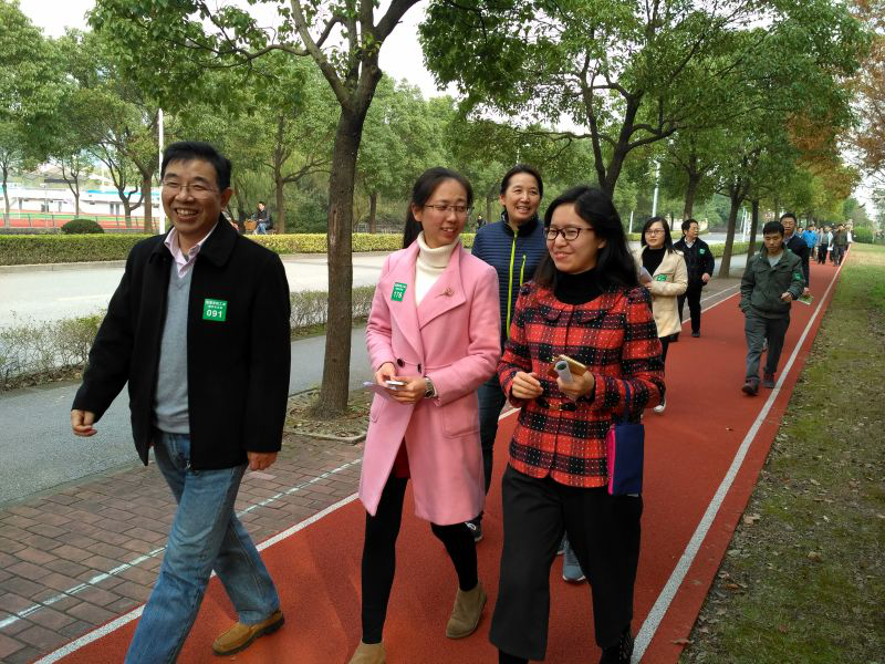 在健步走的过程中,教授与新进教师边走边交流教学、科研等工作经验,老同志与年轻同志交流生活技巧。在欢声笑语中大家走完全程。
