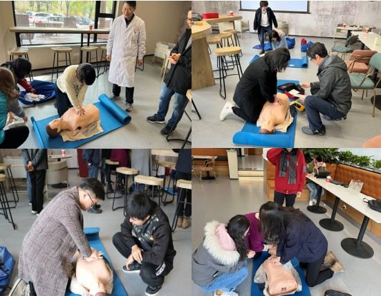 讲座结束后,刘金生经理邀请教职工上台进行现场实践操作,手把手地指导大家。大家在活动中学到了很多实用的应急救护知识,掌握了心肺复苏的实战要领。