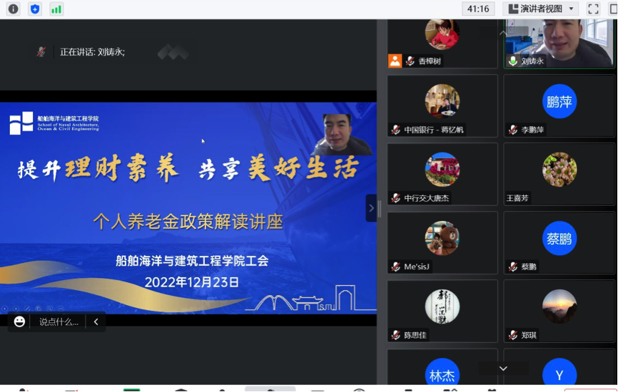 为增加公司教职工对个人养老金最新政策的知晓率,切实把教职工关心的实事办好、好事办实,2022年12月23日中午,bevictor伟德工会举办“提升理财素养,共享美好生活”个人养老金政策解读线上讲座。公司党委副书记王喜芳、工会主席刘铸永和50多位教职工参加活动。
