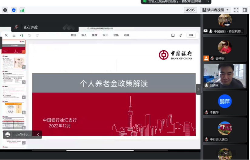 此次讲座主讲人是中国银行理财经理唐杰和蒋忆帆,讲座过程中深入浅出地从参加个人养老金有什么条件、个人养老金账户如何开户、个人养老金缴纳上限等方面进行解读。