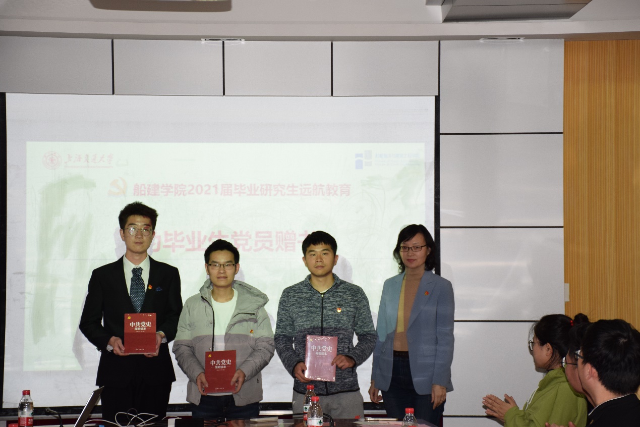 随后,周薇书记向2021届毕业研究生党员寄予了殷切的希望。她表示,船建学子要传承和发扬交大人的优良传统,在迈入工作岗位后,不忘初心,牢记使命,即便遇到困难和挫折,也能直面挑战,学会坚守,祖国建设贡献自己的青春和热血。
