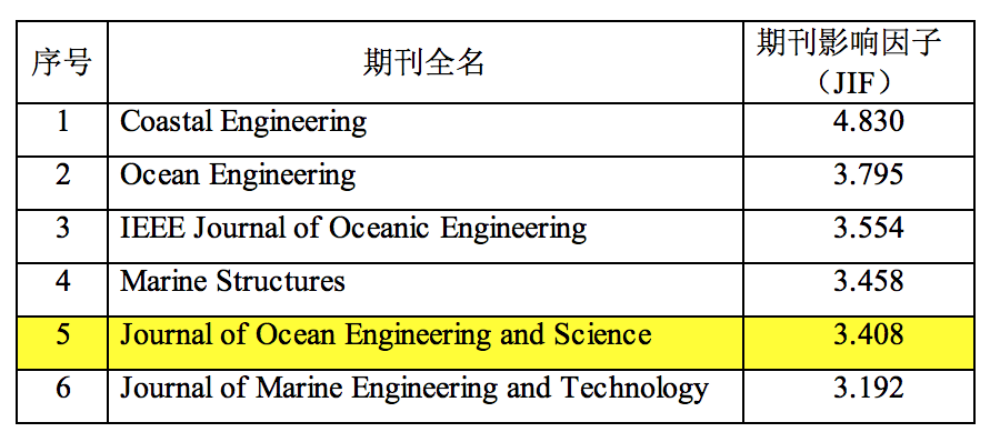 在与船舶与海洋工程领域相关的“Engineering, Ocean”和“Engineering,Marine”两个学科类的所有40本SCI和ESCI期刊中,JOES期刊跻身前5。
