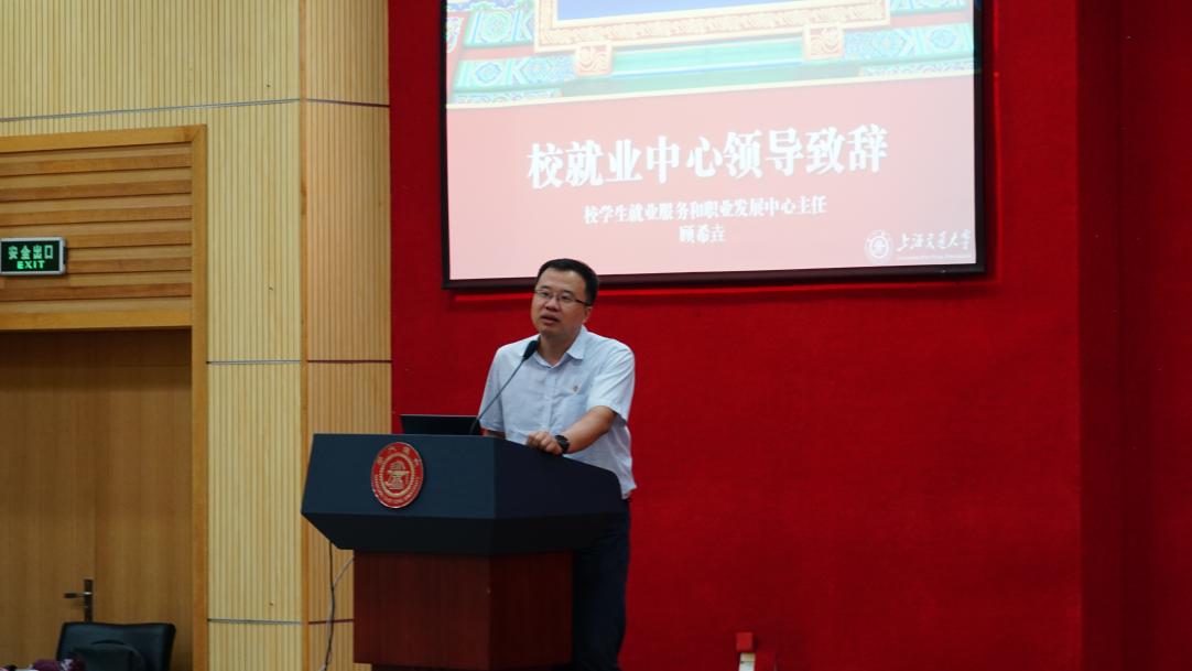 校员工处副处长、员工就业服务和职业发展中心主任顾希垚致辞。顾希垚强调,择业就业一要善于选择,择业时需将目光放长远,选择一份能够不断赋能,不断增值的工作,老老实实做事,踏踏实实做人;二要忠于理想,客观、综合评估自己的实力、兴趣与职业规划再进行择业。