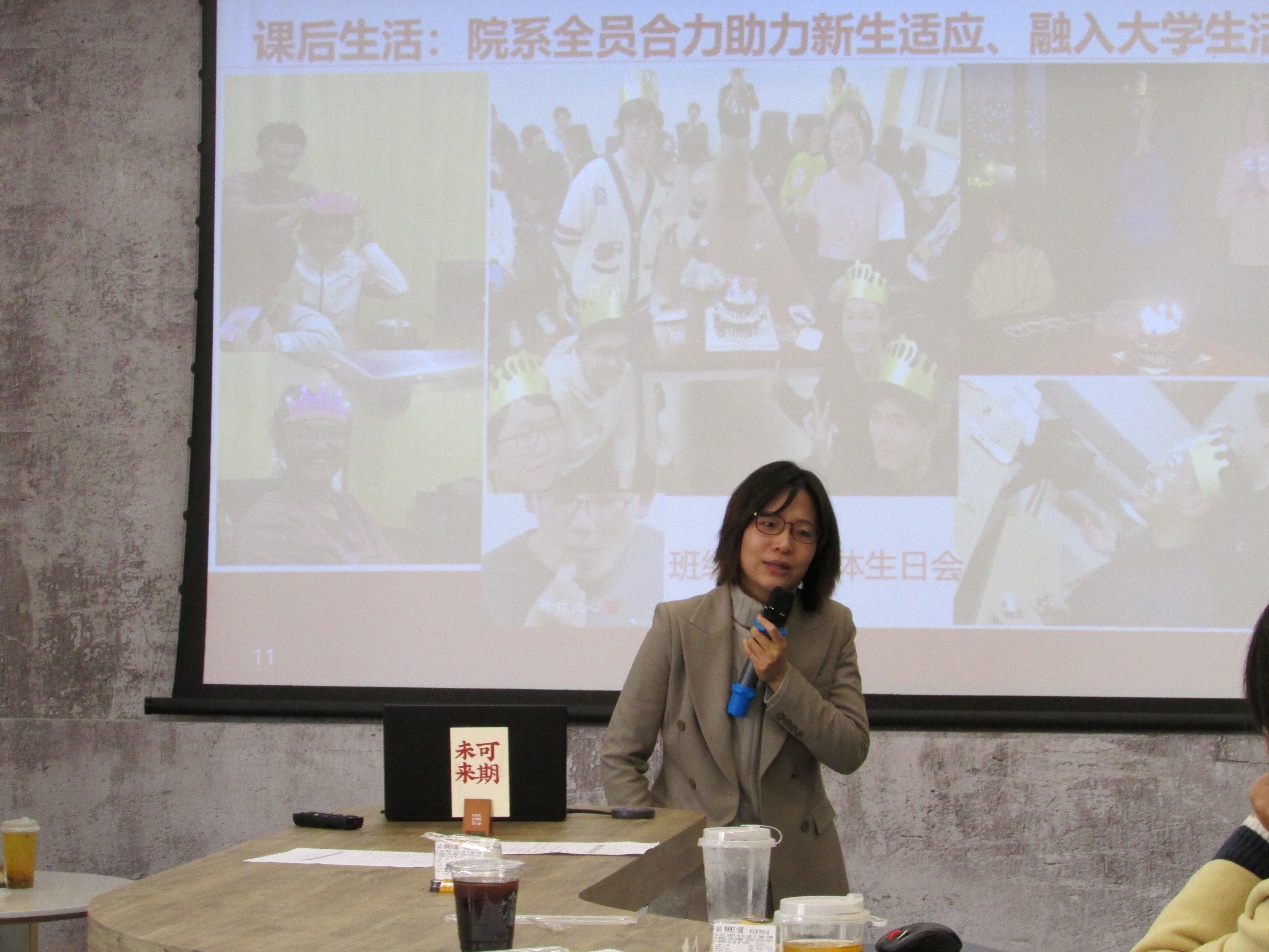 优秀本科生班主任代表李颢、乔恒、郭晓宇介绍带班经验。班主任有别于导师,导师主要致力于对员工学业、科研或职业发展提供个性化帮助和支持外,班主任需要更全面关注员工生活成长、思想健康、人生规划等方面问题,做到全程和全方位育人。班主任一方面要关注班级中每个个体成员的发展,另一方面又要从事班组织集体工作,增强班级凝聚力,例如包饺子、集体生日等,树立员工集体意识,展现人文关怀,使员工更快地融入老员工活。