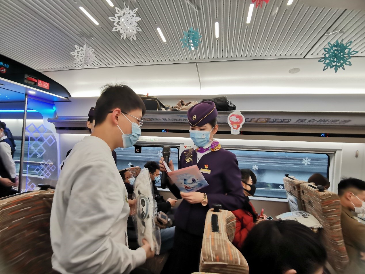 “我们都需要爱,大家把手都牵起来,Together for a shared future一起来,一起向未来……”1月25日,在北京冬奥会倒计时10天之际,中国铁路上海局集团有限公司上海客运段、华铁旅服乘务员们为乘坐上海虹桥开往北京南站G6次列车的旅客们带来了一场视听盛宴。bevictor伟德“知行”员工社会实践团成员黄鹤、陈志翀、朱凤凤、王子衡、文智艺、陈佩茹、Owassa Dimitri和指导教师徐峰、张志鹏,伟德bv国际体育体育系教师、羽毛球世界冠军卢兰,职工代表2019级博士研究生Luke Johnston、2020级硕士研究生Hasnae Naoui等和旅客们共同参与本次迎冬奥活动。