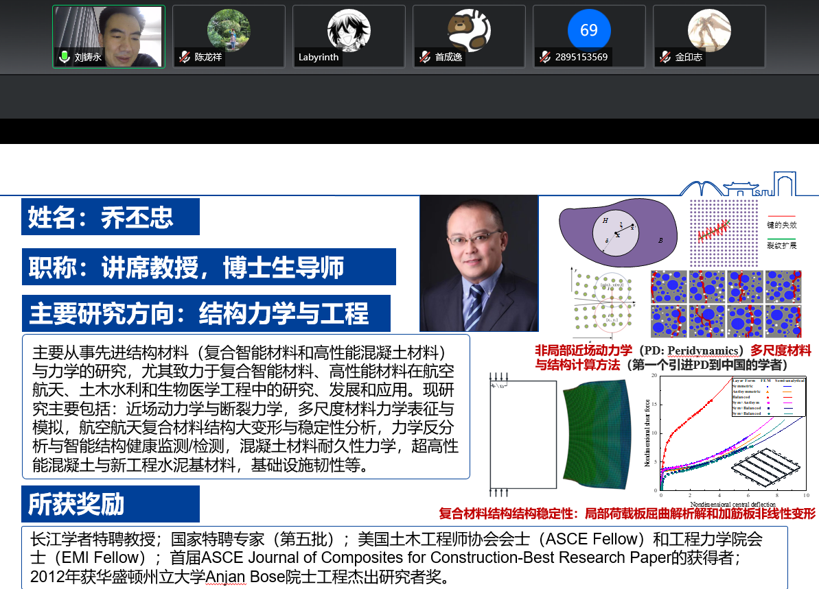 刘铸永按工程力学系不同二级学科方向:动力学与控制、固体力学、流体力学以及实验力学对38位导师的研究方向、科研成果以及所获奖励等方面向员工进行了详细介绍。
