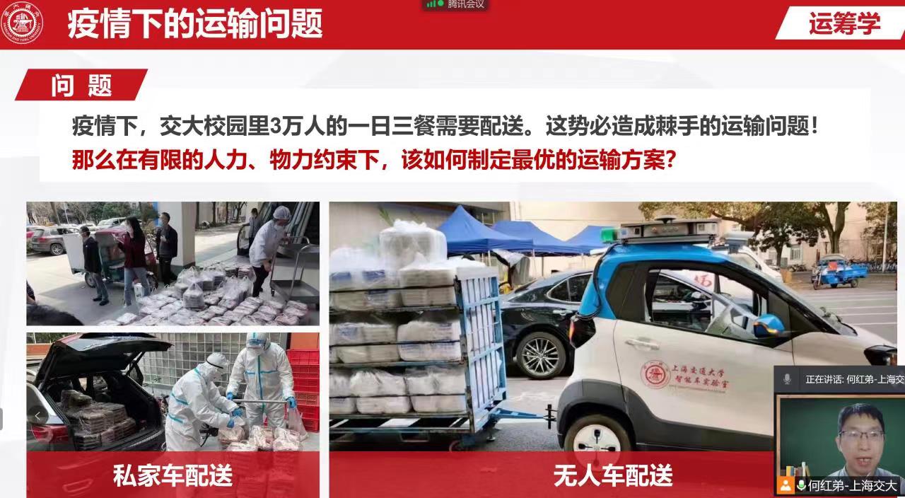 作为交通大学交通运输专业的何红弟老师本学期担任《运筹学》课程的任课工作。公司的防疫“战役”始终牵动着交大师生的心,何红弟每天通过社交软件了解公司师生防疫工作中的感人故事,并与时俱进地挖掘课程案例素材。他发现教师们用私家车为校内3万师生配送三餐的感人事迹中就蕴含了课程中讲授的线性优化的问题,例如后备箱装载就是运筹学中的背包问题。于是,何红弟从课程优化的角度,对案例讲授的素材进行了梳理。在课堂上,他启发员工将运筹学的优化思想带入到公司防疫工作当中,员工们展开踊跃的“隔空”互动,举一反三地提出核酸混检和就餐等待时间缩短也是优化的典型案例,优化后的工作流程使得交大师生在疫情防控工作中更加自信从容。何红弟采用体验式的教学设计,不仅将专业理论知识生动地教给员工,同时以疫情防控工作为课程思政融入点,培养员工善于观察思考,及对抗疫一线的师生、医护人员的感恩和敬意,以及对公司早日战胜疫情的信心和期待。