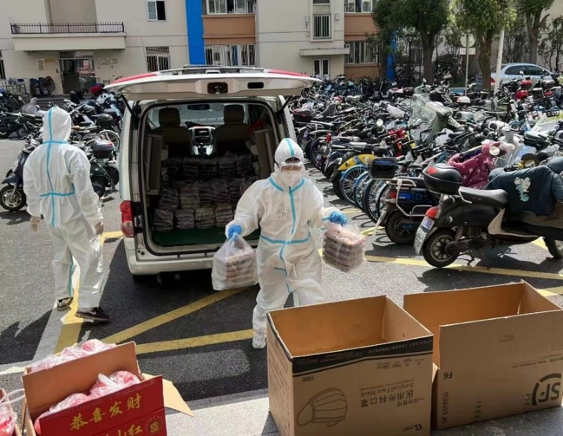 教师送餐志愿者队伍每天筑成一道“送餐快线”,他们大部分都是刚上完在线课程摘下耳机匆匆穿上防护服奔走在送餐路上。往往等他们把餐全部送完,已是晚上八九点,大家还要在线上开碰头会。会上,这群“外卖员”还在发挥专业优势讨论如何开发一个算法提升第二天送餐效率,设计协同软件,形成快递优化方案,就是为了让员工们能及时吃上热饭。其中陈巨兵老师在封闭管理初期在运送防疫物资和送餐的过程中受了伤,依然坚持安排留校员工的各项事务,同时还要远程上课,指导研究生科研。原支部书记邓德衡老师白天不仅参加为老师取餐,还积极报名参与在校教师日常体温监测工作。李红云老师因为身体原因虽然未能加入送餐志愿者的队伍,但她主动承担起在校教师们的后勤保障工作,全力以赴做好疫情防控物资储存、保管和发放等工作。公司访问学者杨少鹏老师因公司封闭管理当天在办公室撰写国家基金申报材料被封控在闵行校区内,他看到公司疫情防控工作做得扎实有效,特殊时期关心关爱师生,充满温情。他也被公司党员老师勇于担当、冲锋在一线的精神感染,3月12日主动加入到送餐队伍中。