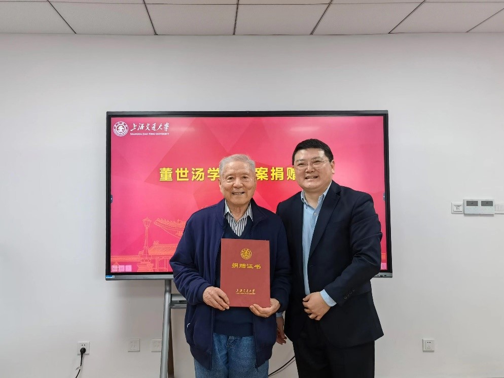 张凯代表档案文博管理中心接受捐赠,他充分肯定了董世汤学长的无私捐赠行为,向董世汤学长颁发了捐赠证书并表达了敬意和感谢,同时希望在档案文博管理中心打造员工人物档案、名人珍贵档案等特色档案资源库的过程中,能得到更多的师生员工和社会各界人士的大力支持、积极捐赠和宣传引导,为交大历史文化的传承积累更多的宝贵资源。