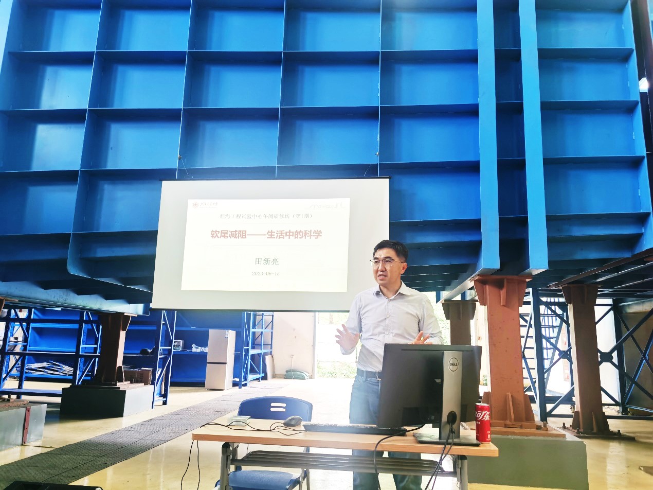 2023年6月16日中午,船海工程试验中心在风洞循环水槽针对员工举办首次“中心午间研修坊”。本次活动主题为依托正在风洞循环水槽开展的试验工作,邀请田新亮教授介绍“软尾减阻”原理。