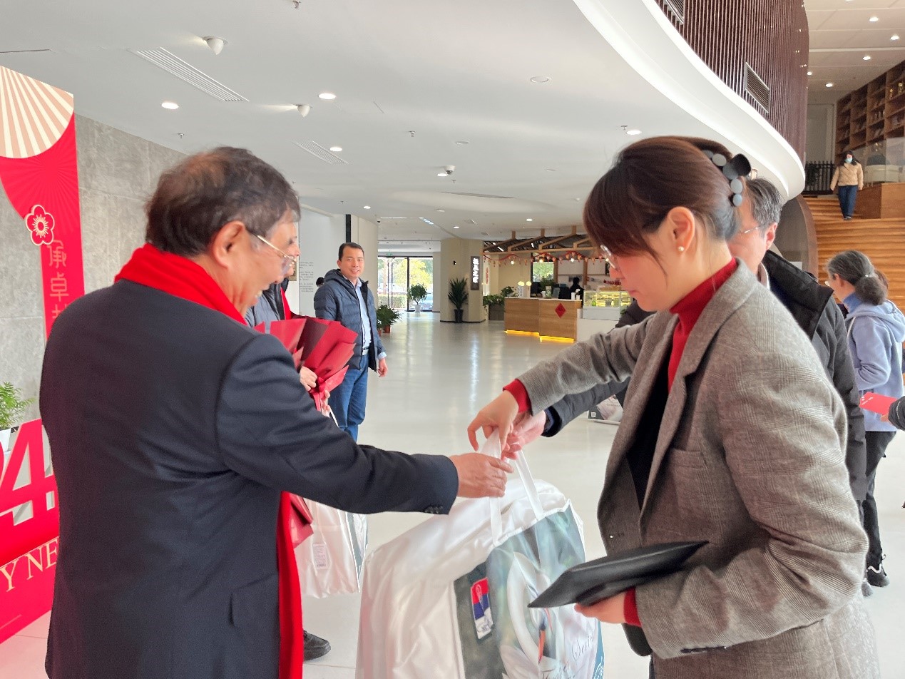 交流会最后周薇、薛鸿祥、刘铸永等代表公司向荣休教师提前致以新春祝福并颁发鲜花和纪念品合影留念。