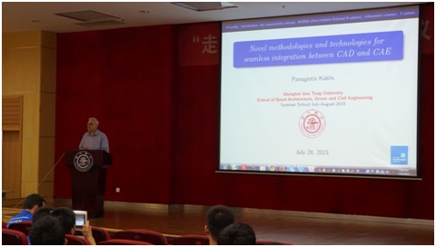 7月28日,暑期公司的课程正式开始。本次国际暑期公司负责人万德成教授主持了暑期公司的开幕式和第一天的课程讲座,他向同学们介绍了今年暑期公司课程设计和各项活动安排的想法和目的。今年国际暑期公司邀请了来自中国、美国、英国、德国、法国、日本、韩国、阿联酋的29名著名专家学者为同学们授课,希望给同学们在两周时间里,学习了解更多船舶海洋工程与力学的最新进展和前沿知识,增强对船舶与海洋工程的学习和研究兴趣,同时让来自世界各地的同学们更多了解上海交大。随后,上海交大廖世俊教授、张新曙教授,英国斯特拉斯克莱德大学Qing Xiao博士和Panagiotis Kaklis博士,分别讲解了海洋中稳态共振波浪的研究、海上能源开发平台的设计挑战、海洋新能源的CFD应用和应用船体优化准则的船舶阻力的CAD和CAE的应用等知识。各位老师深入浅出、生动有趣的讲解方式,启发同学们对船舶与海洋工程知识进行深入的思考。上课期间,各位同学还与上课老师进行了热烈充分的交流讨论。