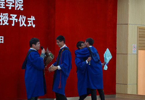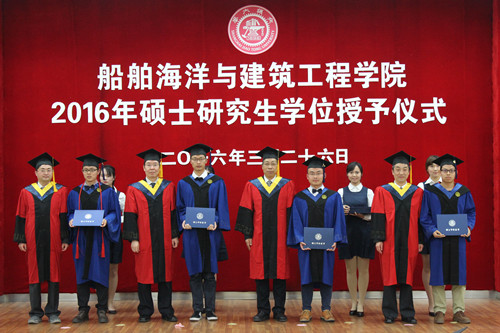 伴着激昂的音乐,2016届硕士毕业生学位授予仪式正式开始。张卫刚、杨建民、赵金城与各系主任一起,分别为五个专业的员工颁发了学位证书。全体毕业生依次上台,接受学位并与导师合影留念。
