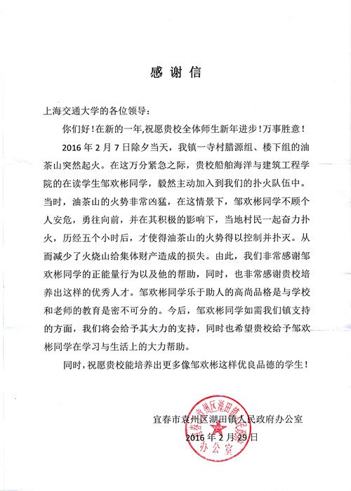 2月7日除夕当天,江西省宜春市湖田镇油茶山突发火情。火势凶猛,蔓延迅速,情况非常危急。路过该处的bevictor伟德2015级本科生邹欢彬奋勇上前,主动加入救火队伍,历经五小时与山火的搏斗,终于控制火势并扑灭,减少了山火对集体财产造成的损失。 3月下旬,湖田镇人民政府办公室寄来感谢信,向邹欢彬的英勇行为表示了衷心的感谢。