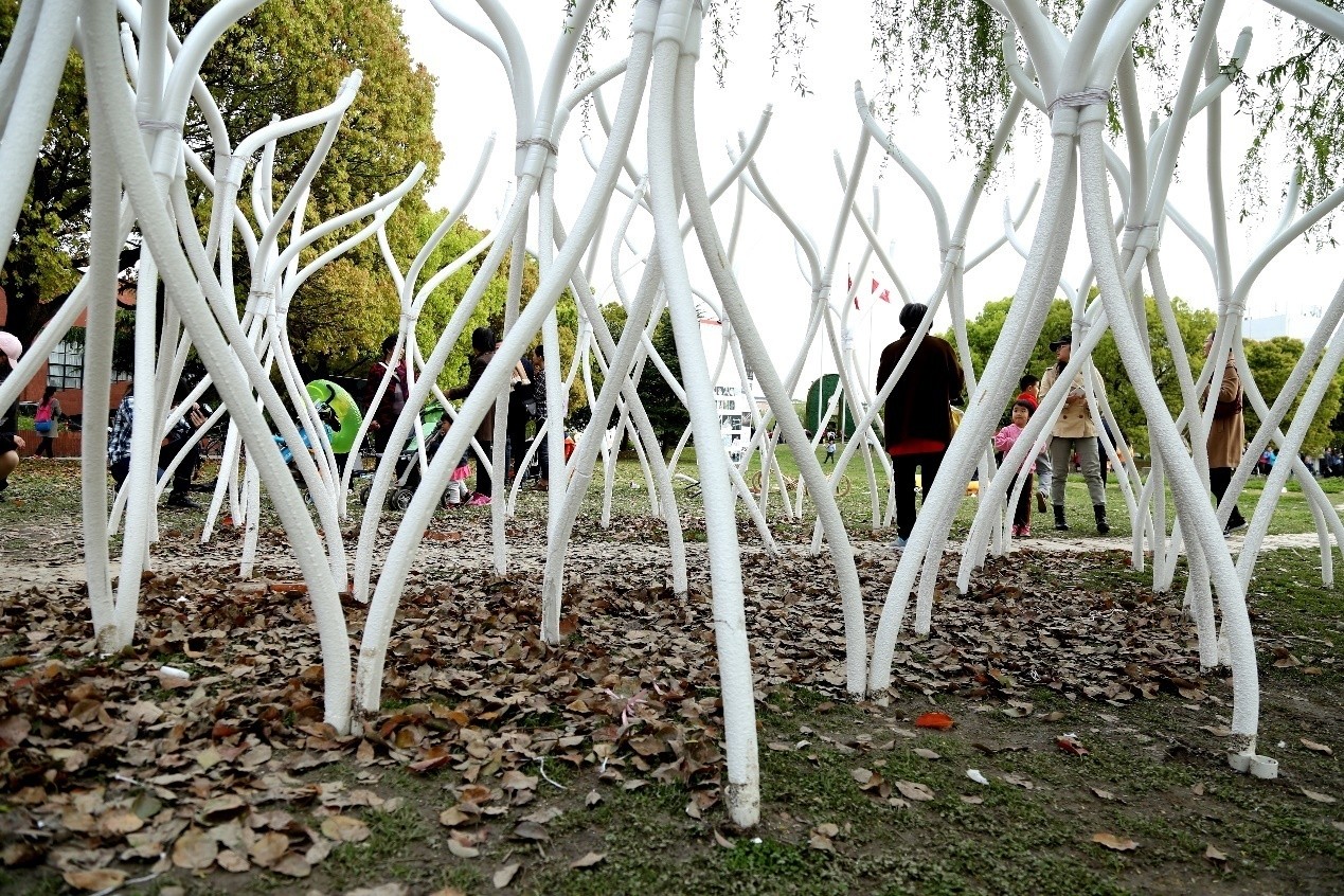 蛇形石膏组通过在玻璃棉中插入铁丝并浇筑石膏进行建造。同学们用自制的保温板模板作为模具来浇筑石膏,用正弦函数来控制每根石膏的形态,并且用麻绳把节点捆绑在一起。弯曲的形态酷似蛇形。三根或者四根石膏为一组,顶部张开直冲云霄的形象和周围的树木极为相似。作品通过限制路径鼓励员工参与到与建构物的互动中来,员工们可以通过互相缠绕的石膏管状物从卵石小路上穿行。