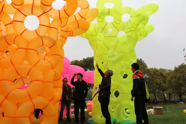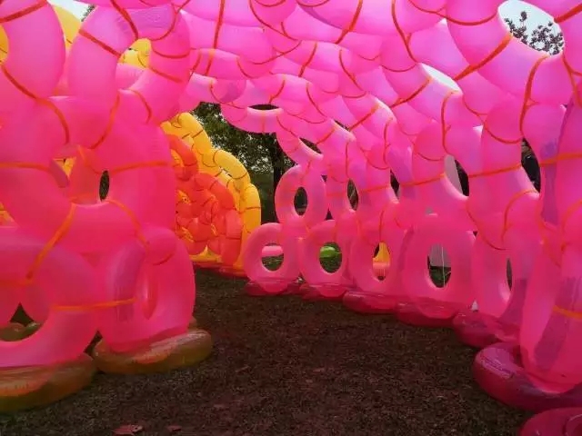 游泳圈组利用扎带把彩色的游泳圈固定在一起完成形态的塑造,构成了体量巨大的直柱和曲面。作品使用了红橙绿三色的游泳圈,半透明的游泳圈过滤了一部分阳光,使空间内不同地区的光影有红橙绿不同的色彩,富有童趣。作品旁还留出一部分游泳圈供员工和小朋友嬉戏,游人也可以继续搭建。同时散落的游泳圈也是极好的座椅,供感到疲惫的游人稍作休息。