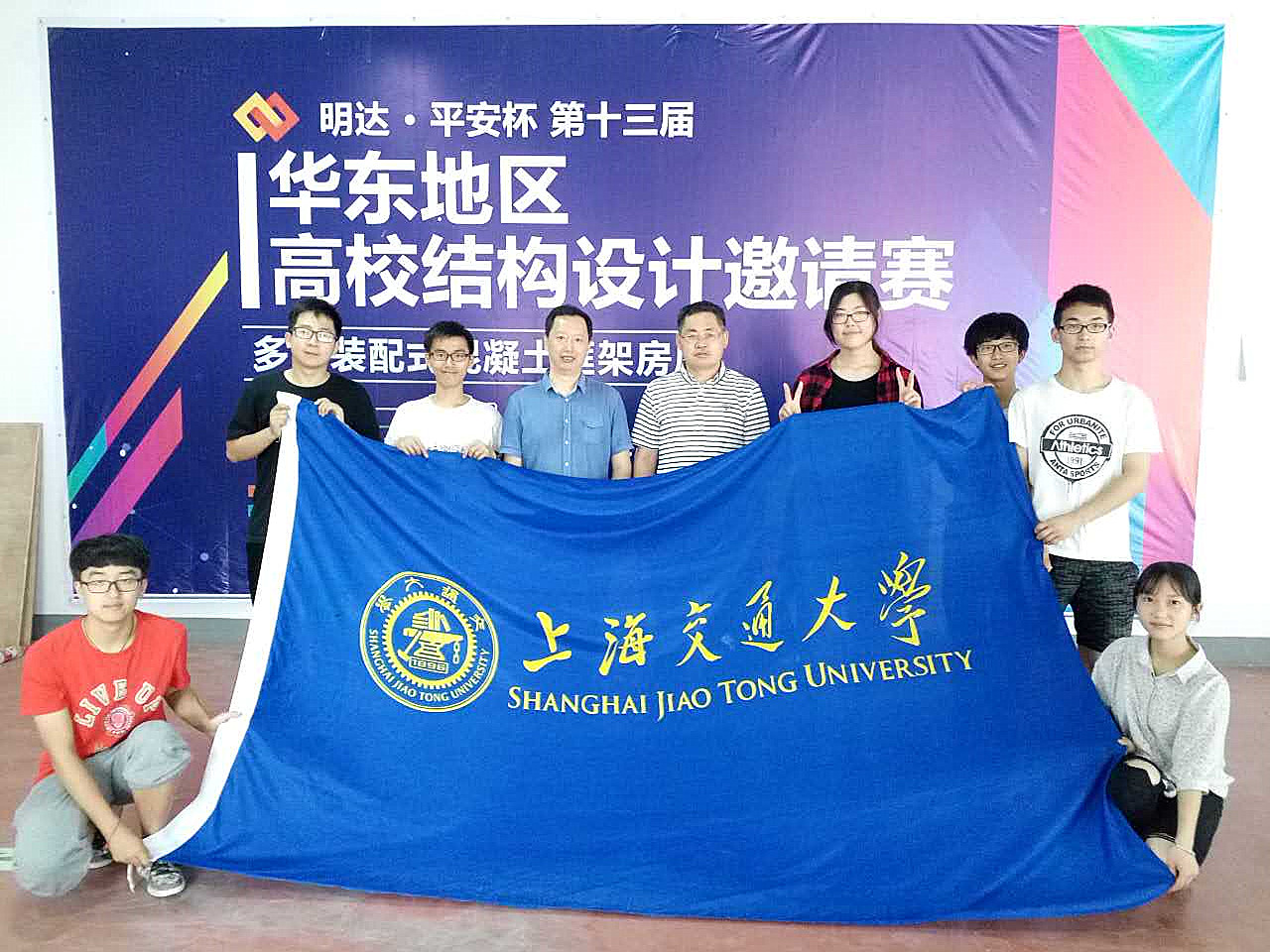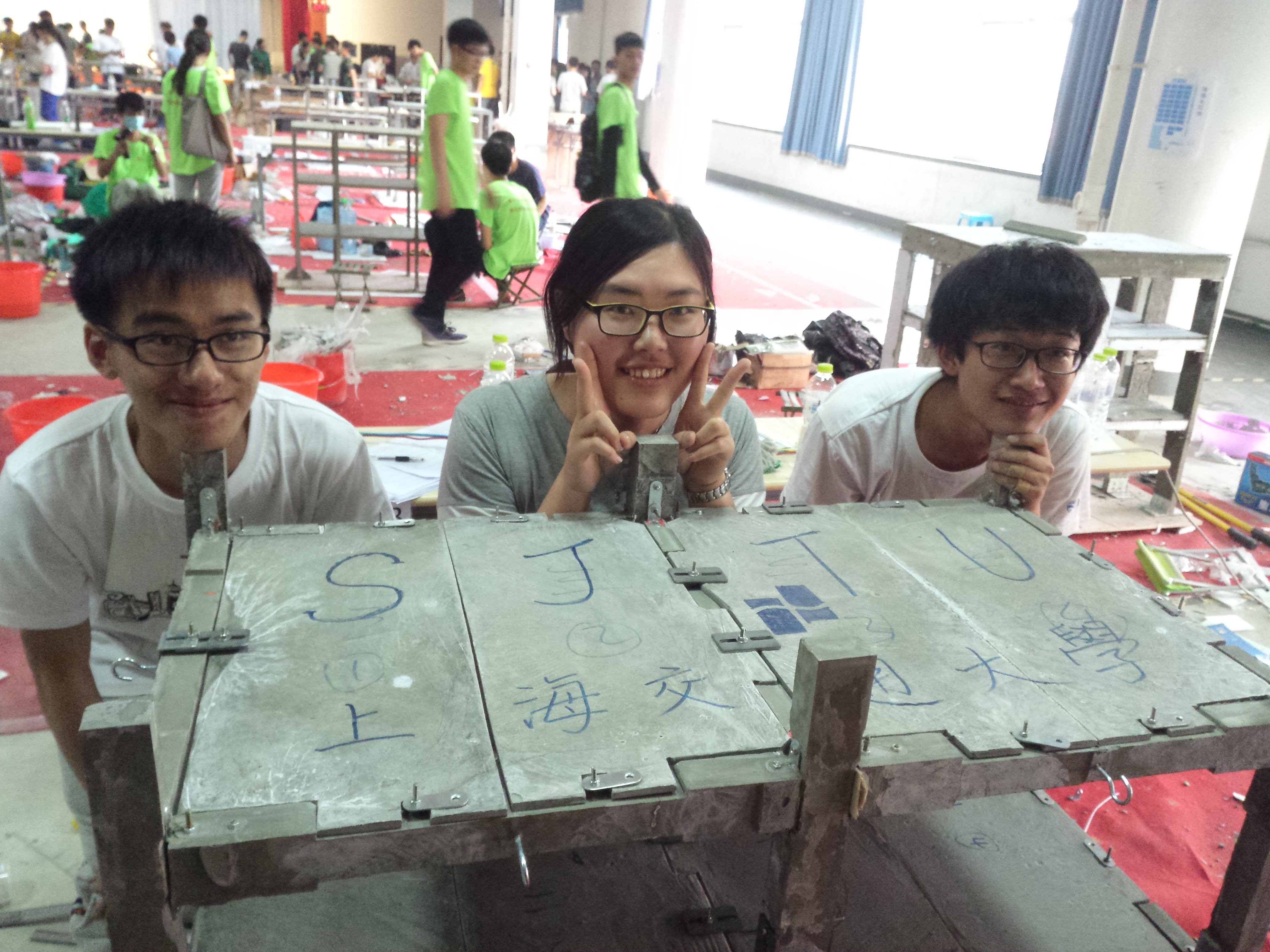 上海交大代表队在本次比赛中以锻炼员工队伍为主,选派了土木工程专业低年级员工,表现却令人十分惊喜。吴晓昂、朱婷、张宜杰团队在赛题准备阶段试验发现梁柱节点内力较为集中,是整个结构中最为薄弱环节,因此在设计中让梁柱节点处界面局部加大,同时在楼板与梁的搭接方式中别具特点,不使用单一构件,保证了结构的整体性。崔琦、蒙婧玺、徐宇冉团队则在模型制作工艺上别出心裁,借鉴局部现浇方法,将模具单元化,分为纵向两榀框架与横向梁,对模具单元进行提前拼接和浇筑,有效地降低了拼接难度。最终两支队伍凭借模型质量轻、制作时间短、残余位移小的优良性能,在35支队伍中脱颖而出,获得第五、第六名。