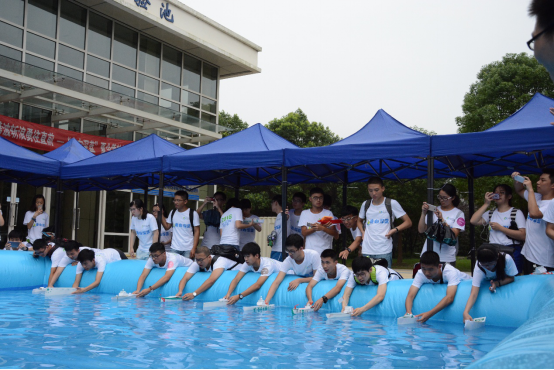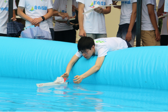 同学们在学长的指导下展开船模“大作战”。经过一天的学习、分组讨论和制作,“走向深蓝”航行器竞速比赛在7月14日下午举行。同学们发挥奇思妙想,制作出的船模都兼具响亮的名字、精致的外观以及风一般的速度。通过比赛的积累、探索和实践,同学们感受到交大为员工创造的科技创新的氛围、精益求精的科研精神。