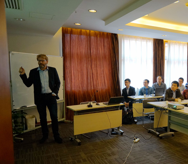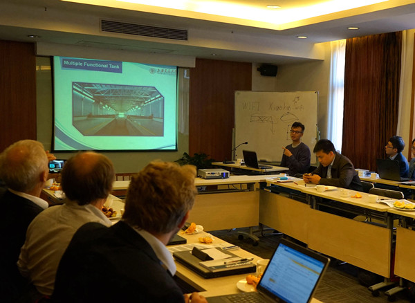 Jensen等6位来自丹麦技术大学的专家介绍了DTU的海上风机研究进展,包括多种类型风机的风场布局优化以及风机智能叶片的研究。王同光带领的团队介绍了玻尔兹曼方法在航空声学领域的应用以及考虑大气边界层效应的风机尾迹的数值模拟方法。来自金风科技的风机研发专家介绍了他们在风机设计及工业生产中的进展,并提出了实际工程中遇到的难点,希望通过与上海交大等研究机构加强合作,共同解决风机研发中的工程应用问题。