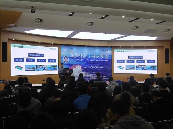刘老师的主题报告从沈阳自动化研究所概况开始讲述。研究所成立于1958年,主要有机器人、智能制造和光电信息这三个方向;员工近1200人,硕士生650人,设有5个博士培养点、8个硕士培养点和2个博士后科研流动站;除沈阳本部外,在四个城市设有分支机构。紧接着,刘老师就“我们从哪里来?”“如何认识海洋?”这两个问题与同学们探讨生命的奥秘、海洋的奥秘——生命起源于海洋,海洋中丰富的物质和资源值得不断探索和挖掘。随后,刘老师从项目概况、控制系统、深潜试验和科学考察四个方面重点讲述了蛟龙探海的全过程,整个载人深潜工程项目由潜水器、母船、潜航员及其应用构成。最后,刘老师为沈阳自动化所的招生招聘简单做了一下宣传,欢迎广大交大学子前去发光发热,有所作为。