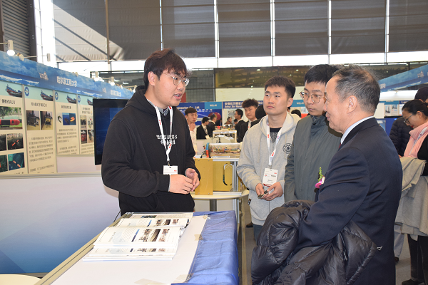 展会期间,员工展台受到了专业观众广泛关注,其中赵国成、马昭、赵伟杰团队的《基于漩涡水动力特性的触须集群式海底集矿装备》、娄建坤、欧阳子路、向金林、王昱淇、王申涛团队的《追梦三号·智能无人船艇》吸引了许多嘉宾驻足了解,观众络绎不绝。中国造船工程学会李国安副理事长到展台了解员工作品情况并与师生合影留念。