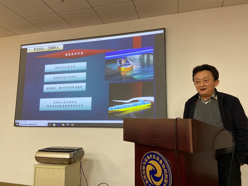 接着三位研究生导师代表分享了自己多年来培养研究生的心路历程和心得体会。船舶与海洋工程系导师代表马宁老师首先分享了自己培养研究生的几点心得。马老师提到,导师要践行“不忘初心、立德树人”,首先要起到模范表率作用;重视营造实验室良好的学术氛围、指导员工养成严谨务实的工作学习习惯;需理论结合实践、培育工程领军人才需具备的知识涵养和能力;全力支持培养员工的国际视野。导师还需对员工关心呵护,亦师亦友。从学术研究上要严格要求,并且注重计划性;培育实验室的大家庭意识,重视氛围建设。培养员工的责任担当之心,发现问题及时与各方通力解决。导师还应因材施教、促进每位员工的成长成才。对 “逸才”的优秀员工给予更大的学术发展空间,对基础一般的员工发挥其特长,增强其信心并树立目标。教育员工树立远大理想,成为国之栋梁、学术之星。