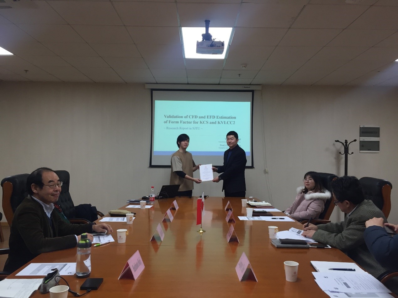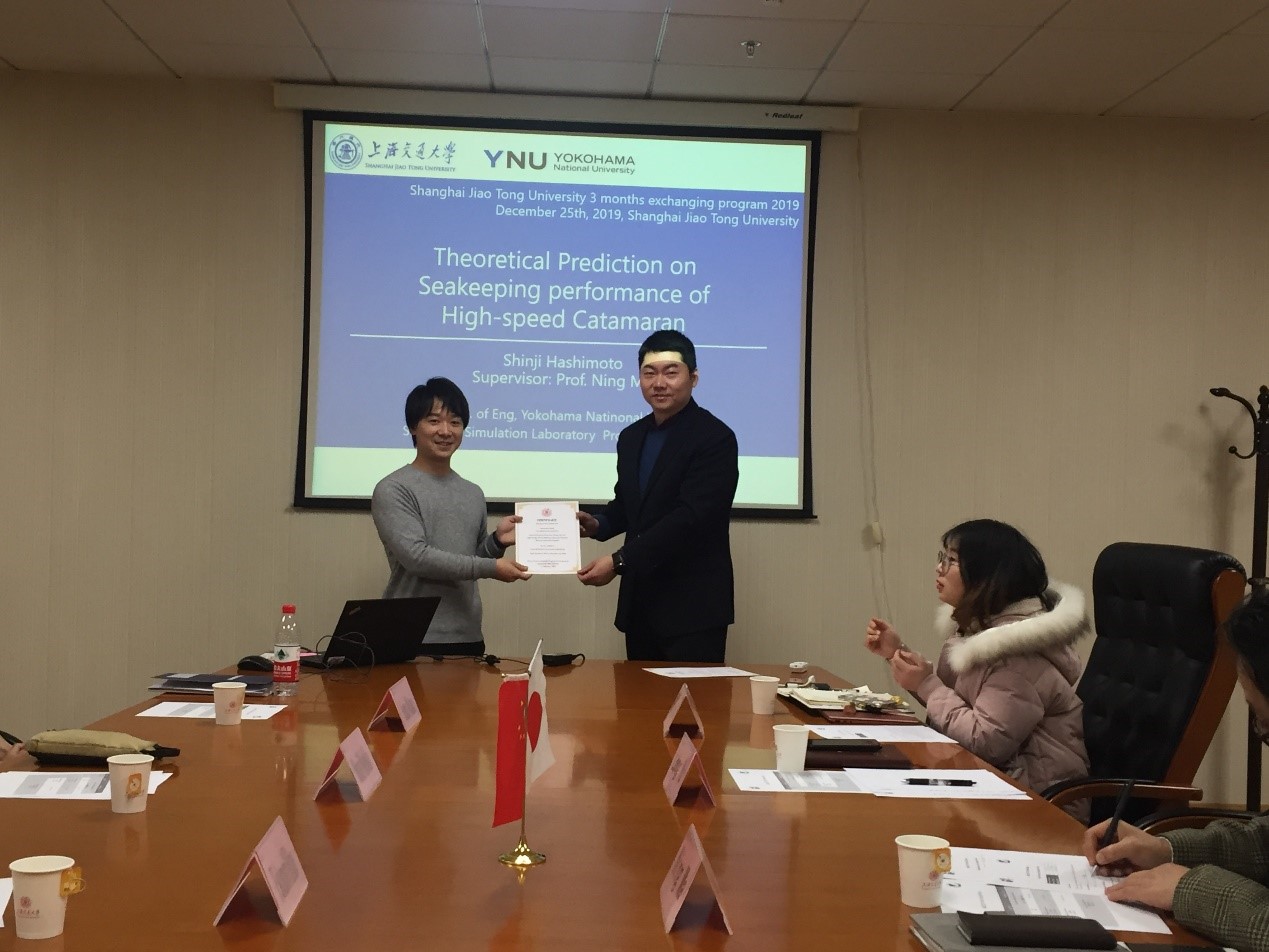 12月26日2019年度SJTU-YNU Joint Workshop暨日本横滨国立大学短期(三个月)交流交换生结业典礼在木兰船建大楼A1008会议室举行,bevictor伟德导师代表马宁老师、陈作钢老师、余龙老师、顾解忡老师和学工办史舒婧老师,公司船海系、土木系部分员工代表出席结业典礼,横滨国立大学(YNU)的Takanori Hino和Motohiko Murai两位教授专程前来参加结业典礼和员工答辩。