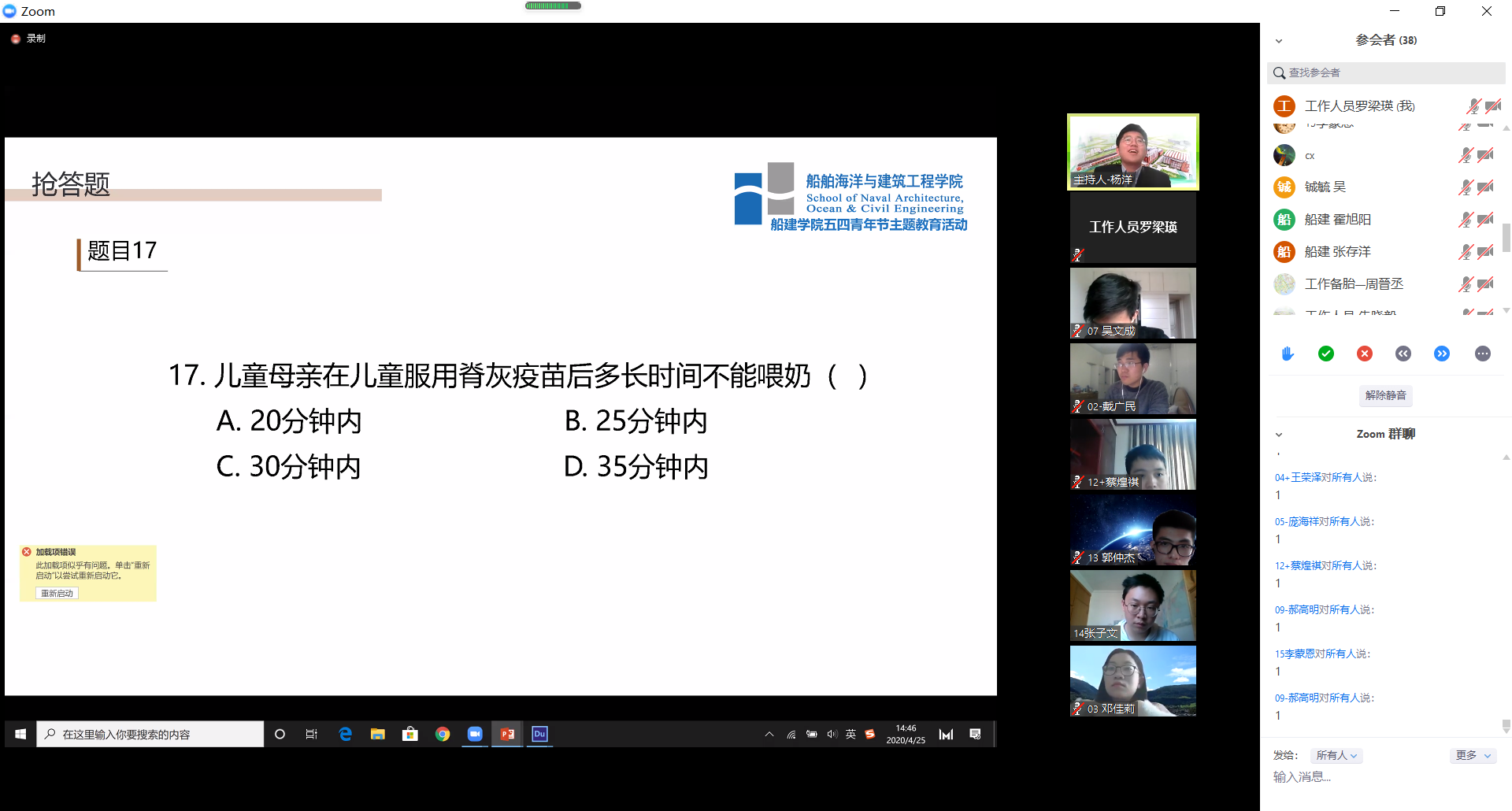 2020年4月25日下午两点,bevictor伟德“舶鲸杯”知识竞赛在zoom会议室线上举行。本次“舶鲸杯”知识竞赛旨在鼓励船建青年关心时事,留意生活,并且为大家科普一些公共卫生常识。