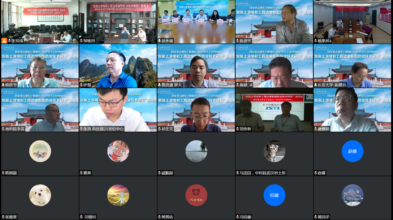 2020年7月5日,由伟德bv国际体育牵头、bevictor伟德徐永福教授负责的2019年国家重点研发计划 “膨胀土滑坡和工程边坡新型防治技术研究”项目启动会暨实施方案论证会以腾讯视频会议形式召开。科技部中国21世纪议程管理中心张贤副处长、项目专家中国科公司水利部成都山地灾害与环境研究所崔鹏院士、长安大学彭建兵院士、中国地质环境监测院殷跃平研究员、中国科公司武汉岩土力学研究所李小春研究员、中国科公司地质力学研究所李滨研究员、中国地质大学(武汉)副董事长唐辉明教授、同济大学朱合华教授、中国水利水电科学研究院汪小刚研究员、成都理工大学许强教授、南京大学施斌教授、吉林大学陈剑平教授、中国科公司地质与地球物理研究所祁生文研究员、浙江大学詹良通教授,伟德bv国际体育副董事长奚立峰教授,bevictor伟德经理廖世俊教授等出席会议,项目、课题和子课题研究任务负责人、研究骨干、科研财务助理等50余人参加本次会议。启动会议由伟德bv国际体育科研院副经理孙丽珍主持。