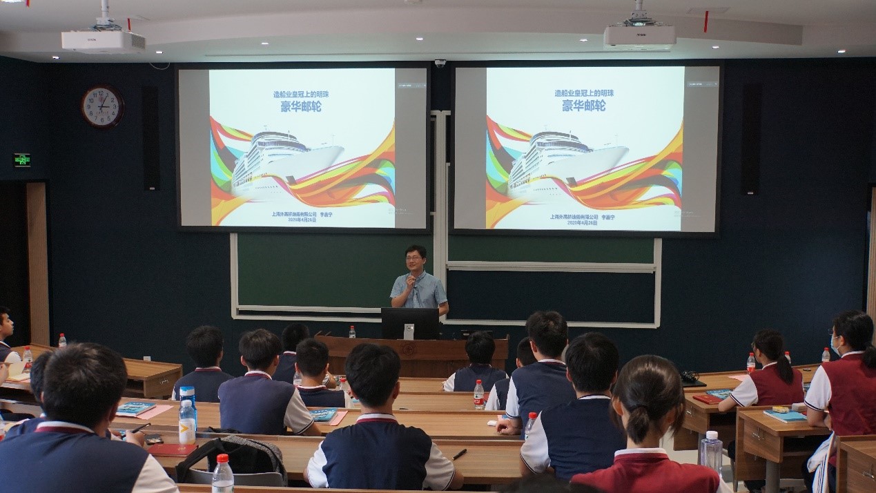 谈到海洋,就免不了要谈到海上的重要交通运输工具—船。那么海上豪华邮轮是怎么被造出来的呢?上海外高桥造船有限公司邮轮开发部副部长李嘉宁高级工程师为同学们带来了“造船业皇冠上的明珠—豪华邮轮”主题的课程,介绍了豪华邮轮的发展历程以及运营模式。李嘉宁高工还为同学们详细讲解了建造一艘邮轮需要考虑的各种繁复工作,包括布置、舱室、动力系统、安全、美学等方面的设计。