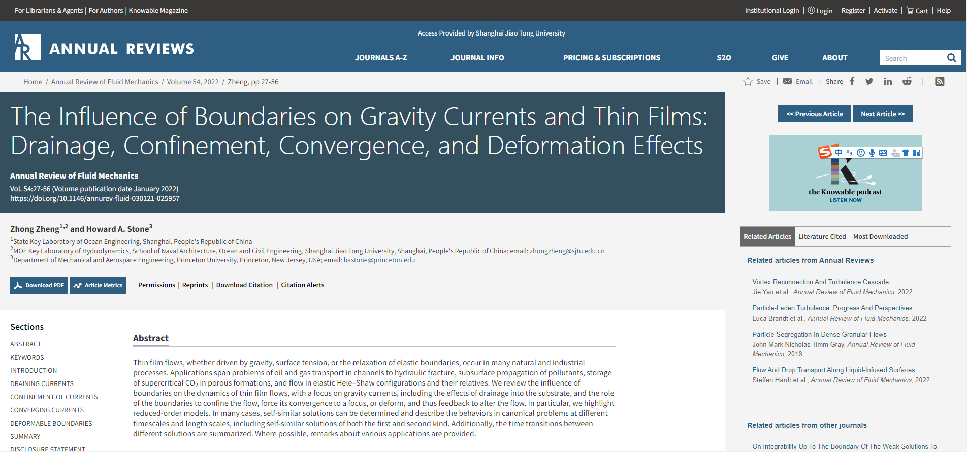 bevictor伟德郑重博士受邀在《流体力学年鉴》 发表关于异重流及液膜的论文