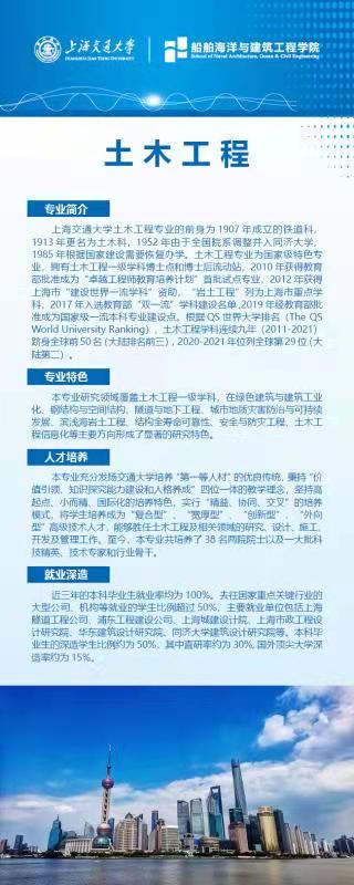 实行高起点、小而精的创新人才培养体制。近五年来获国家优秀博士学位论文提名奖1人、上海市优秀博士学位论文称号4人、上海市优秀硕士论文称号3人。本科生每届约60人,师生比超过1:1。土木工程专业注重员工的素质教育和能力培养,积极组织员工到大型设计院实习、毕业设计,到大型建设工地施工实习,参加国家、上海市以及公司的创新试验项目。员工在全部六届“全国高校结构设计竞赛”中均获一等奖,为国内仅有。员工毕业后可到土木工程专业相关领域的大型研究院所、设计院、施工单位、政府建设管理相关部门及房地产公司等单位工作,学习成绩优秀者可免试直升攻读博士、硕士学位或出国交流学习。